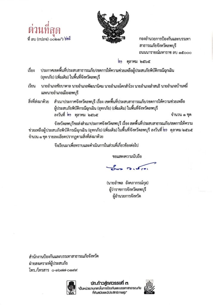 จังหวัดลพบุรี ประกาศเขตพื้นที่ประสบสาธารณภัย/เขตการให้ความช่วยเหลือผู้ประสบภัยพิบัติกรณีฉุกเฉิน(อุทกภัย)(เพิ่มเติม)ในพื้นที่อำเภอชัยบาดาล